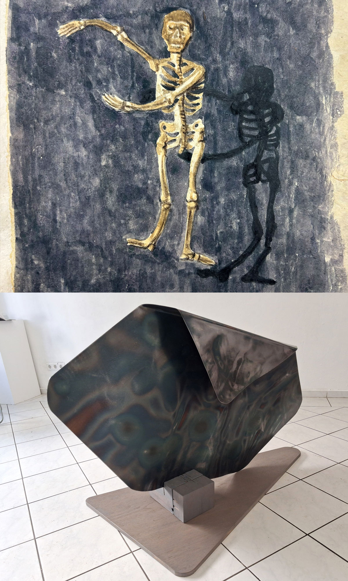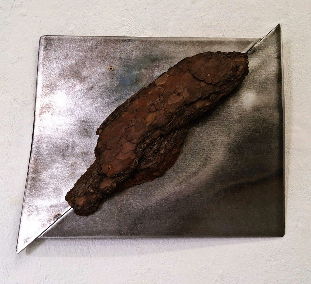 For decades, Margret Holz has devoted herself in her multifaceted work to the various effects of time on history, on the memory of historical and fictional places, and very tangibly as an influence on sculptural material. With the sculpture »Fallen shadow 01«, the sculptor shows a folded-down surface that exhibits amorphous, shadow-like shapes in deformed steel. What we see here is the slow and concentrated penetration of heat through fire into the material of steel, through the controlled and precise work of the sculptor. The formerly uniform surfaces deform under the power of the heat, and the color nuances of the shadows testify to the formative and also destructive, archaic power of fire. In Margret Holz’s minimalist sculptures, sculptural action materializes, which can be read both as a burn mark and as a metaphor of imprinted time for the unrepresentable shadows of history.